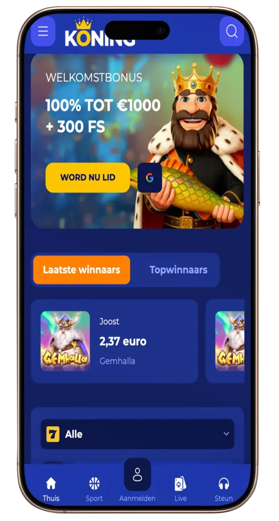 De Koning Casino app staat gokkers toe om op een snelle en eenvoudige manier te spelen. Het neemt niet veel geheugenruimte in beslag en alle spellen zijn geoptimaliseerd. De mobiele omgeving is compatibel met Android en iOS apparaten en geeft je toegang tot het beheren van je account of het spelen van een van de 8.000 digitale games in ons aanbod.