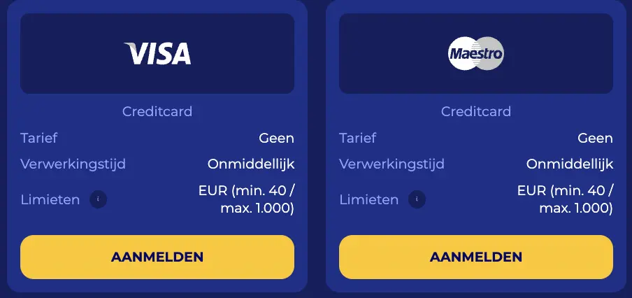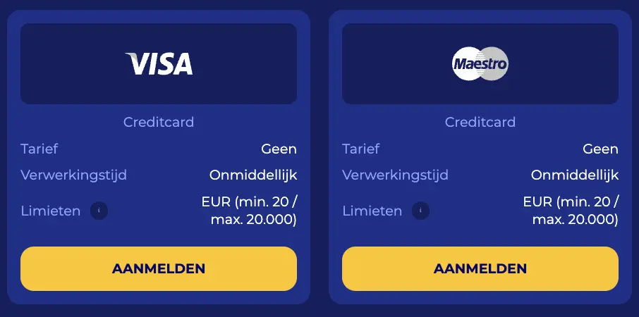 | VISA | Vul je naam, voornaam en kaartnummer in. Voorzie hierna de CVV code en de vervaldatum van je kredietkaart. Kies een bedrag dat je wilt storten en bevestig de betaling. | €10 / €4.000 |