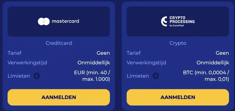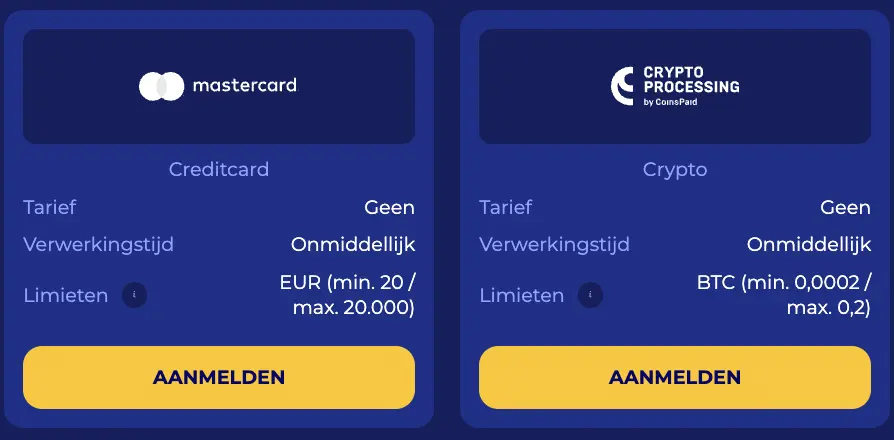 | E-wallets | Geef je persoonlijke gegevens in. Kies het bedrag dat je wilt storten. Zodra je dit gedaan hebt, word je naar de inlogpagina van je e-wallet gebracht. Je kunt dan inloggen en een betaling uitvoeren. | €10 / €2.500 |