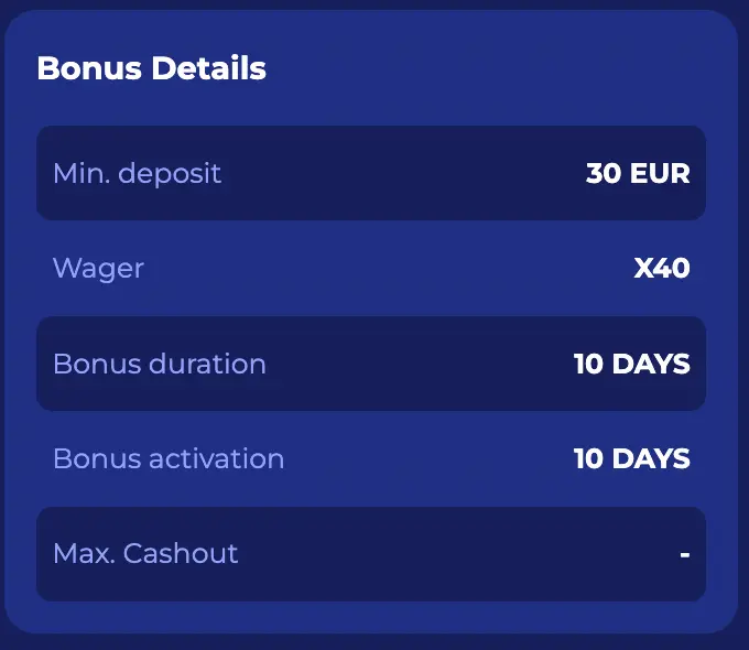 Indien je een van deze aanbiedingen wilt claimen, moet je er ook voor zorgen dat de storting voldoet aan het minimale stortingsbedrag voor de bonus. Deze informatie vind je in de bonusvoorwaarden op de promotiepagina.